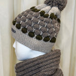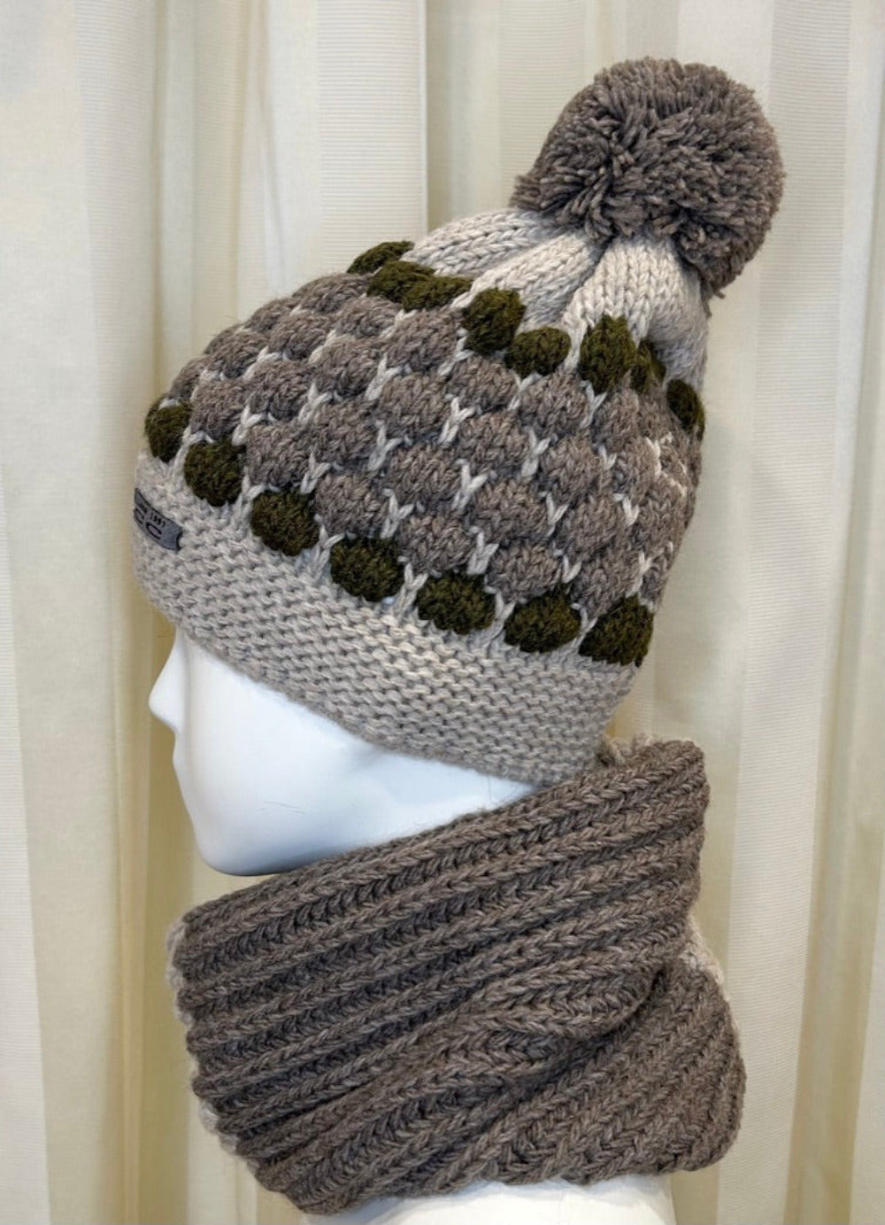 Completo: cappello beige/tortora/verde con pom pon e scaldacollo bi-colore beige/tortora in misto lana (100% Made in Italy)
