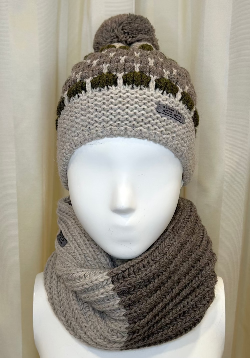Cappello e scaldacollo beige/tortora/verde CAPOCUBO misto lana con pom pon