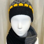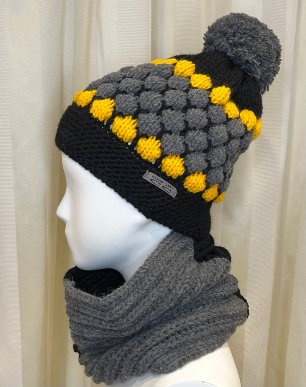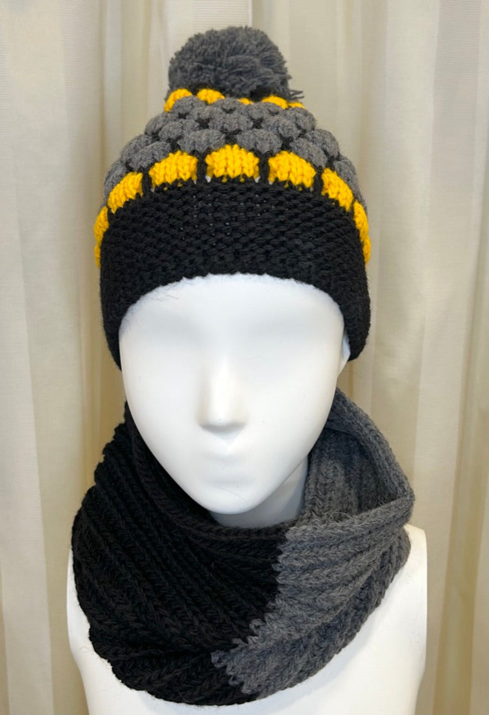 Completo: cappello nero/grigio/giallo con pom pon e scaldacollo bi-colore nero/grigio in misto lana (100% Made in Italy)
