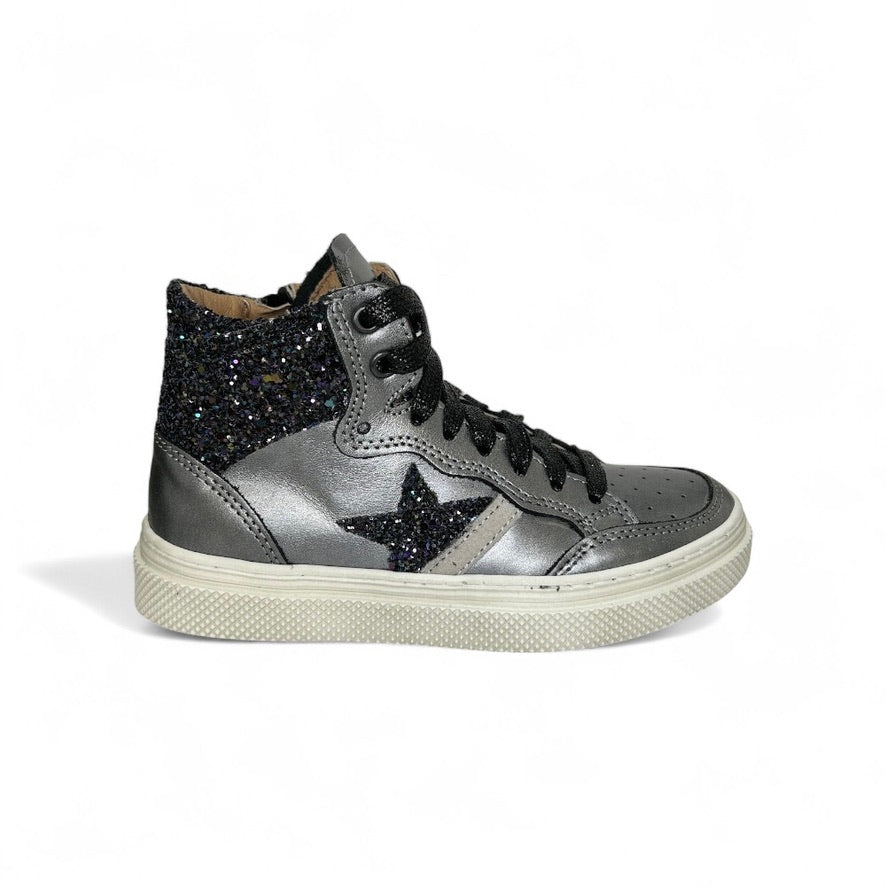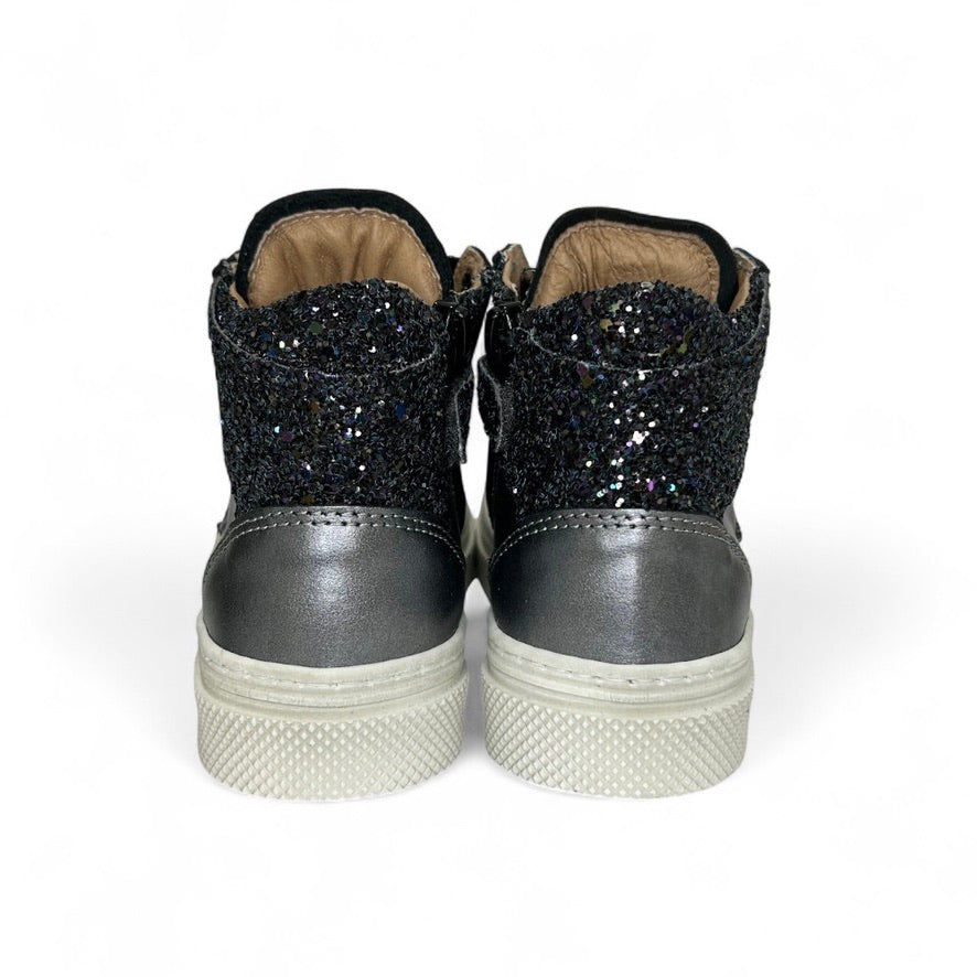 Sneaker DIANETTI mod basket mid in pelle metallizzata antracite e glitter nero con lacci e zip laterale