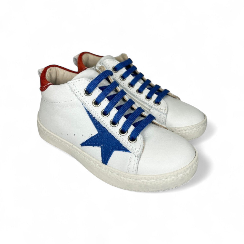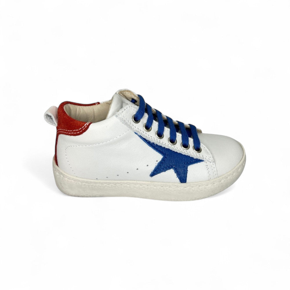 Sneaker LESCOUCOU in pelle bianca/bluette e suede rosso con lacci e zip laterale