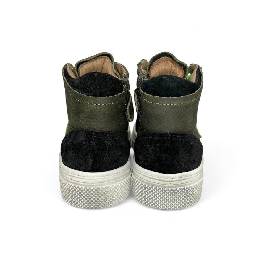 Sneaker DIANETTI mod basket mid in nubuk verde militare/suede nero e verde fluo con lacci e zip laterale