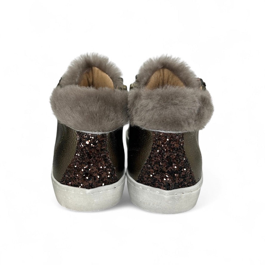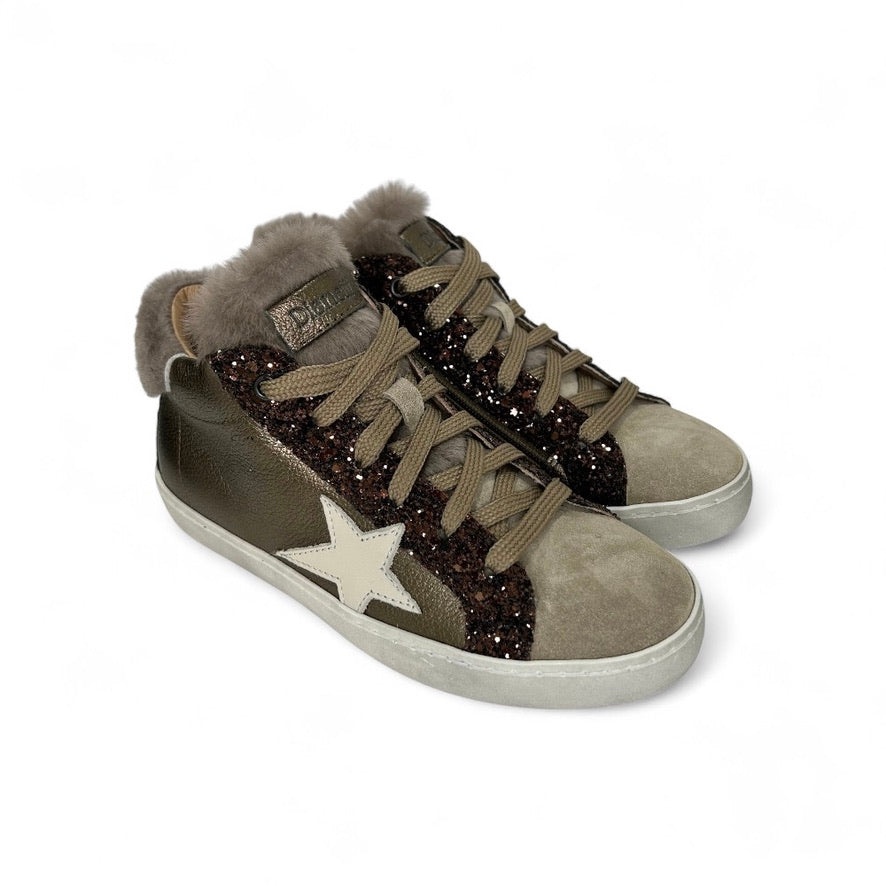 Sneaker DIANETTI mod basket mid in pelle metallizzata bronzo/glitter/pelliccia tortora con lacci e zip laterale