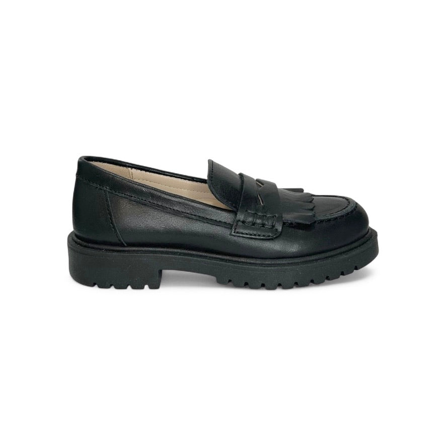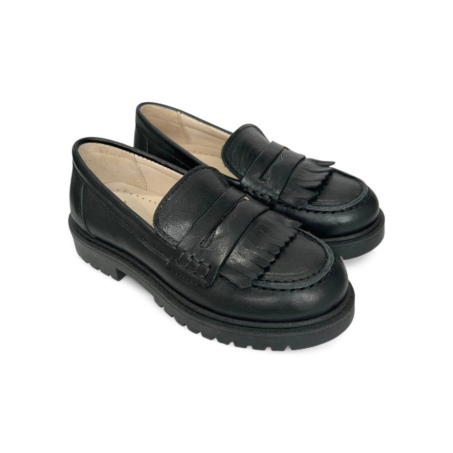 Eleganza e comfort si incontrano in questo raffinato mocassino in morbido vitello, pensato per accompagnare le bambine in ogni occasione speciale e nella vita di tutti i giorni. Il dettaglio con frange dona un tocco classico e senza tempo, mentre la calzata comoda assicura libertà di movimento. Fodera e plantare in pelle.