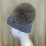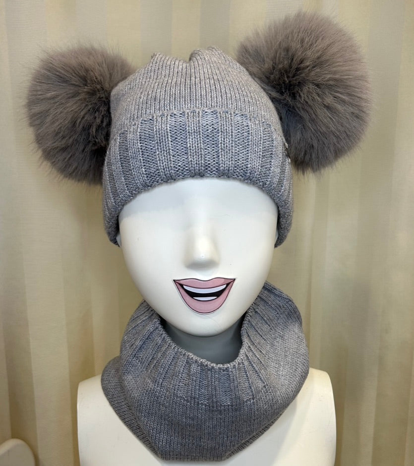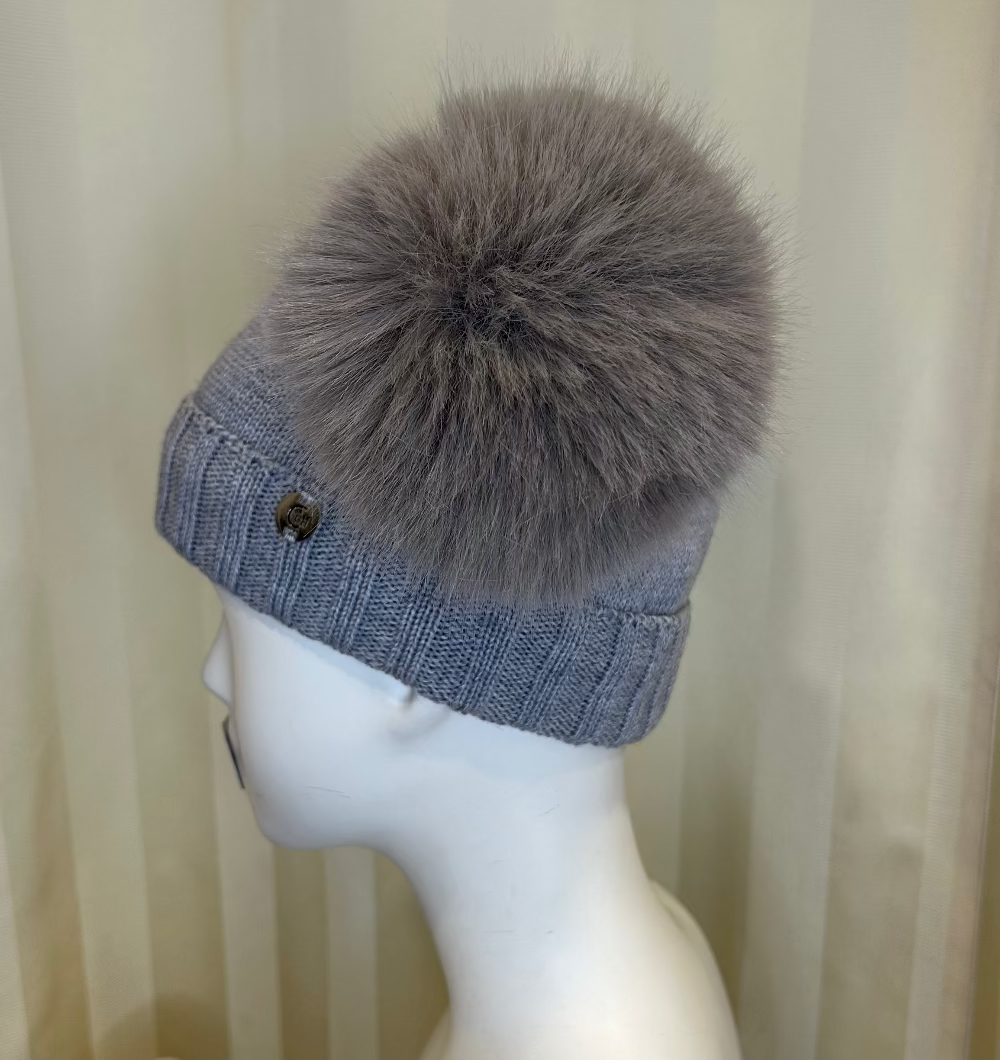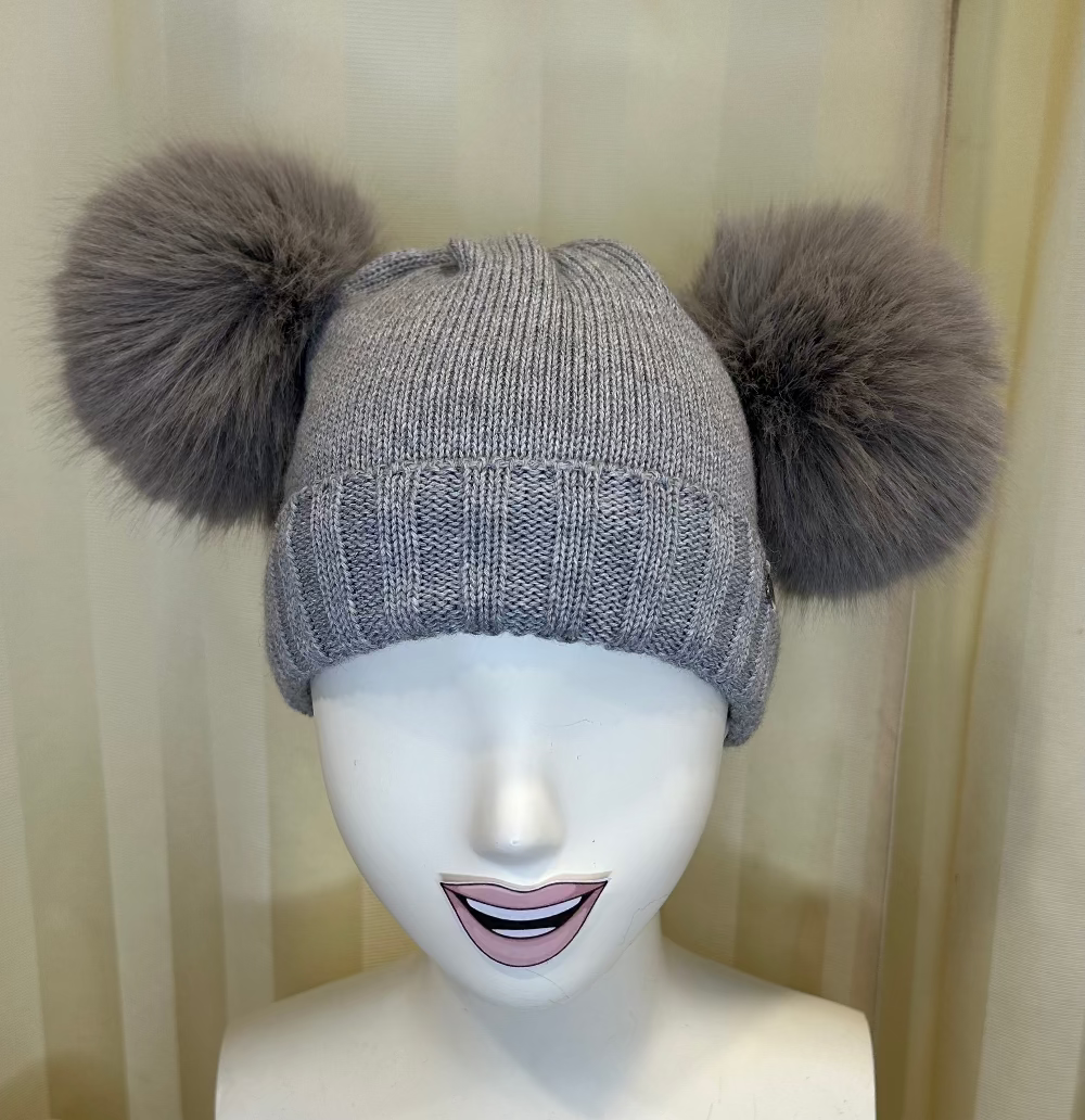 Cappello grigio GIO HIGUAMY misto lana con doppio pompon in volpe ecologica