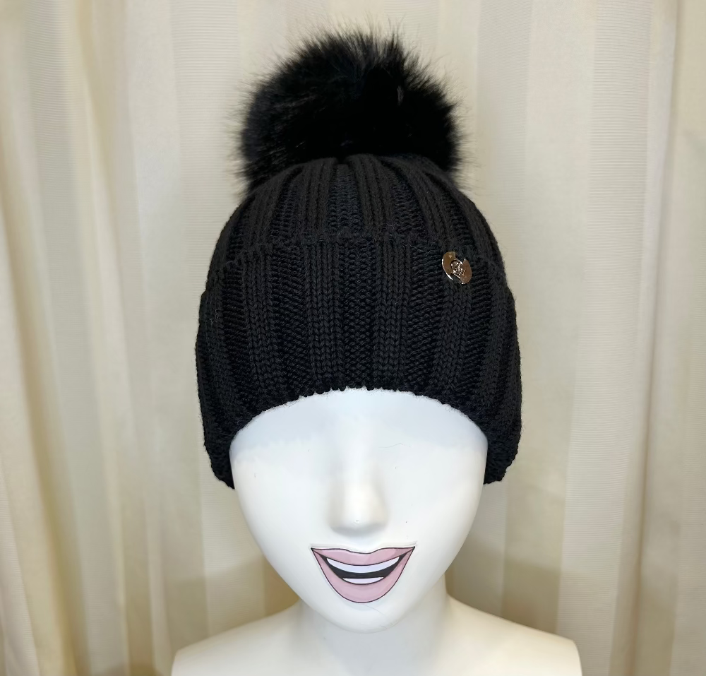 Cappello nero GIO HIGUAMY misto lana a coste con pompon in volpe ecologica (100% Made in Italy)