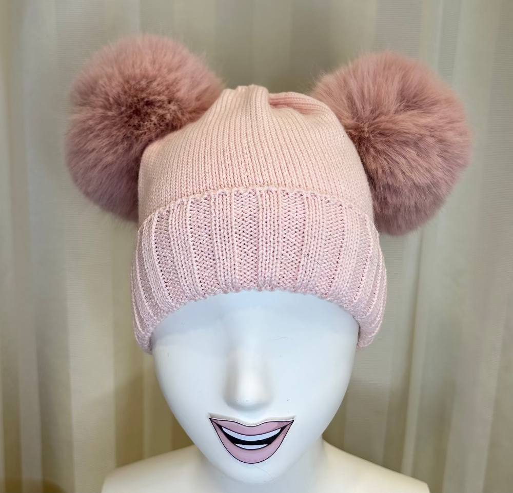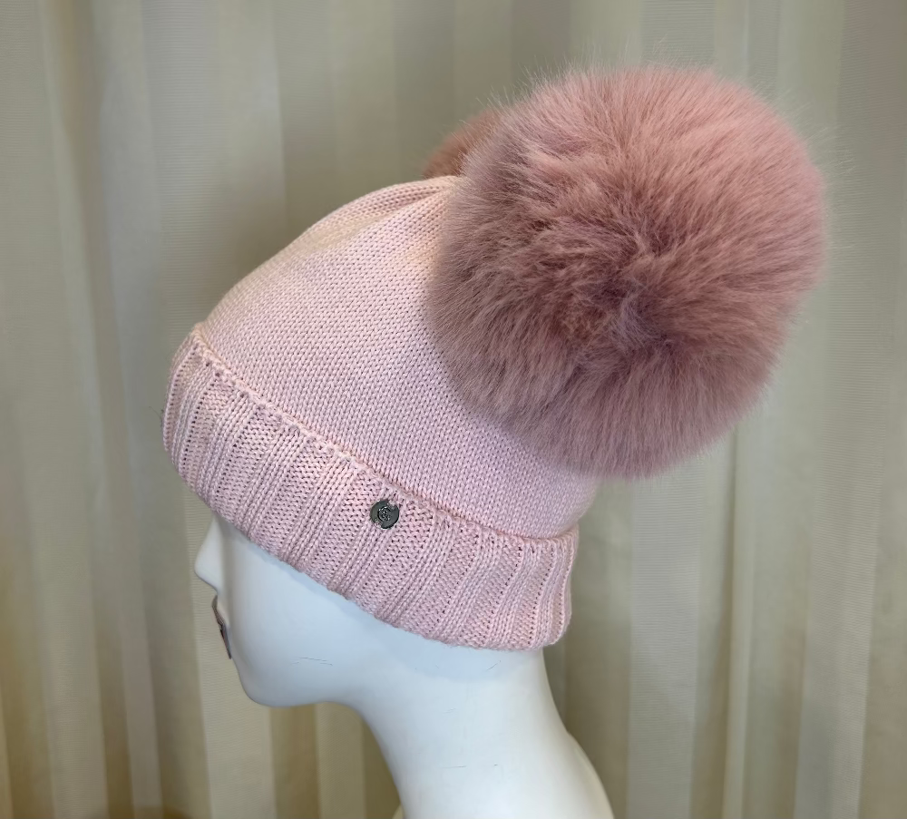 Cappello GIO HIGUAMY rosa con doppio pompon in volpe ecologica (100% Made in Italy)