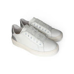 Sneakers Dianetti in pelle bianca. Tallone in pelle metallizzata e micro glitter argento, chiusura con lacci e zip laterale. Lacci in tulle decorato e lacci in cotone bianco in dotazione. Fodera in pelle. Sottopiede ergonomico ed estaribile in cuoio. Lavorazione artigianale, 100% made in Italy.