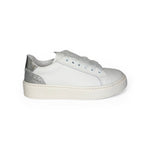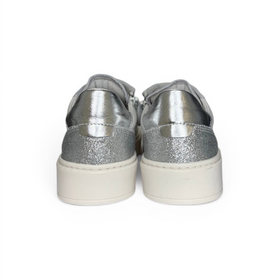 Sneakers DIANETTI in pelle bianca/micro glitter argento con lacci in tulle e zip laterale